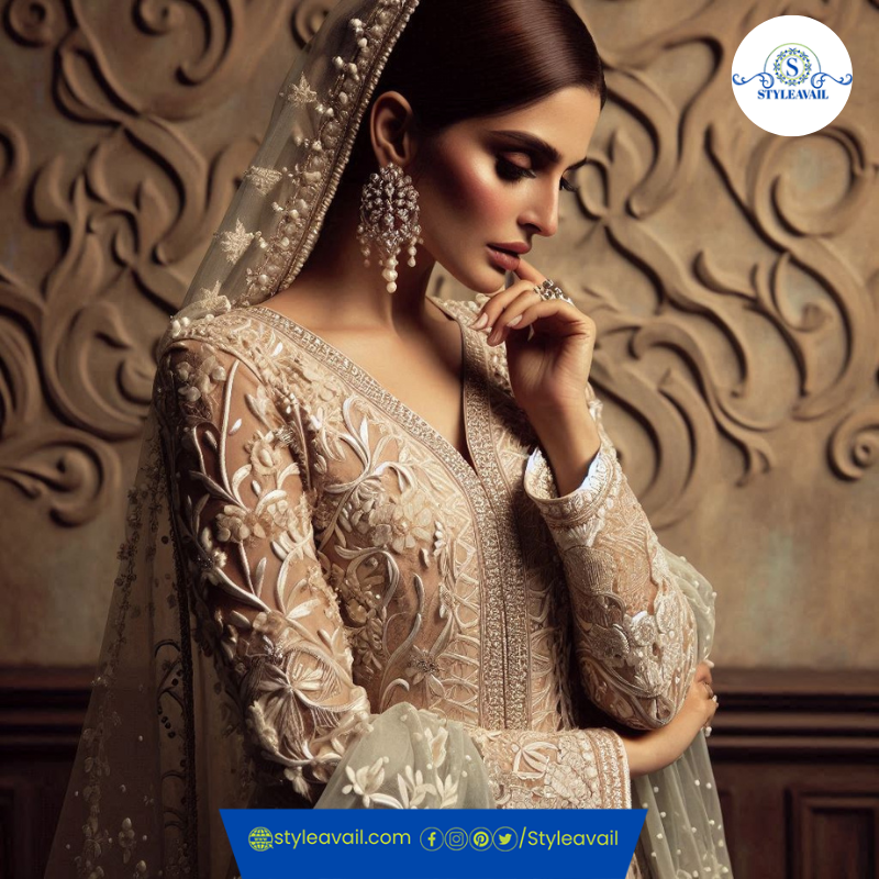 A Mukesh Work Saree is a beautiful traditional outfit, often made of chiffon or silk, featuring silver foil embroidery. It’s similar in shine and elegance to the Mukesh work you now see in Pakistani wedding invitations.