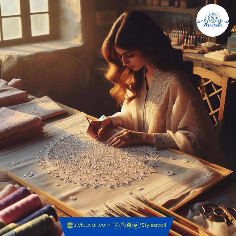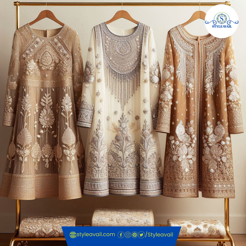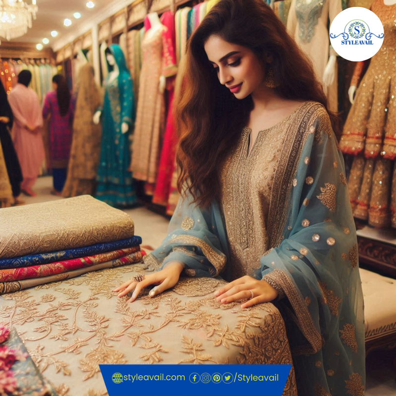 Because it involves hand embroidery with real metallic threads like silver and gold. The intricate craftsmanship and detailing take time, similar to what you find in high-end Mukesh suits in Pakistan.